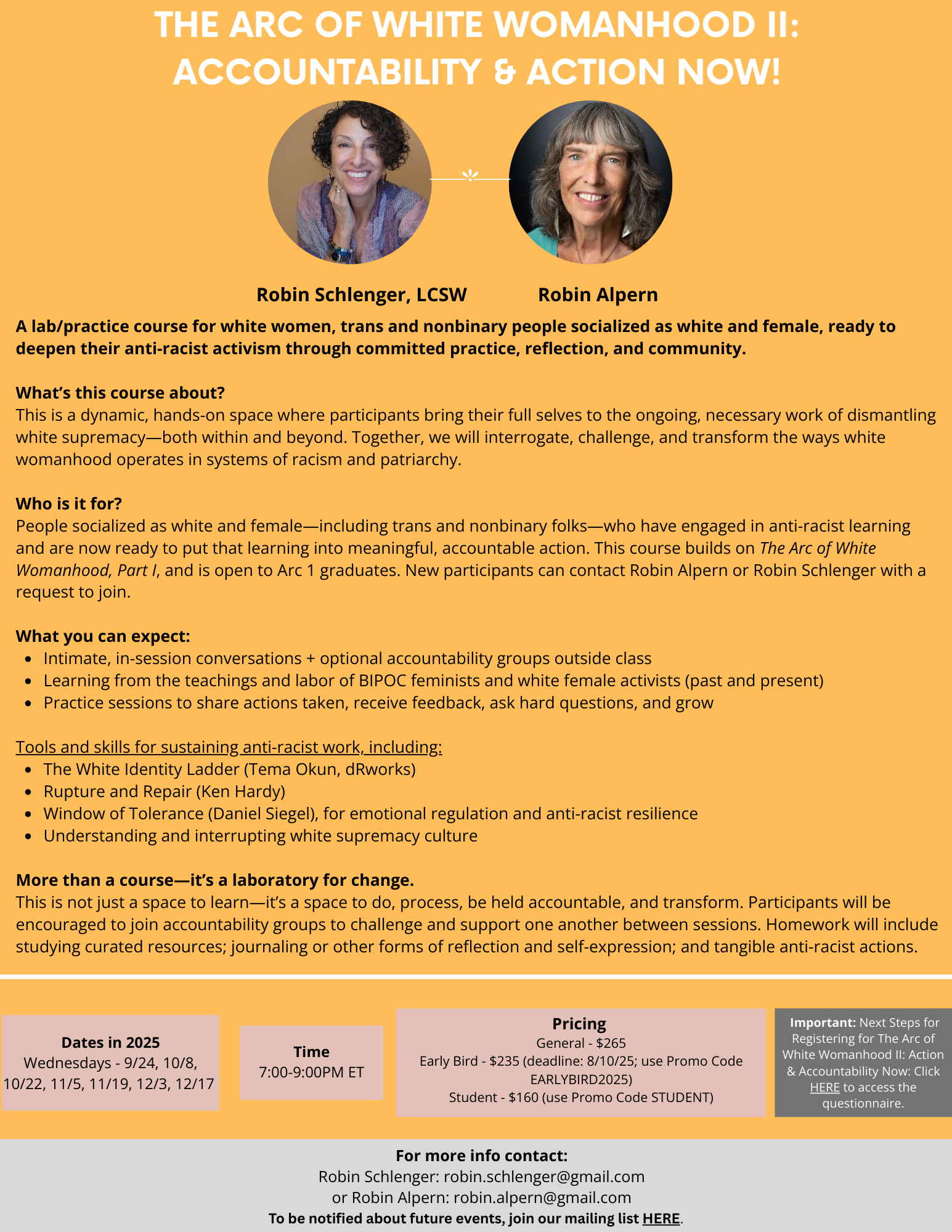August is a threshold month—warm and reflective, with one foot in summer’s looseness and the other pointed toward the structure of fall. As Robin Alpern and I prepare to launch our new course, The Arc of White Womanhood Part 2: Action & Accountability Now (see below for registration), this moment feels like more than a seasonal transition. It’s a call to examine what we’ve been rehearsing—and what we’re ready to release.